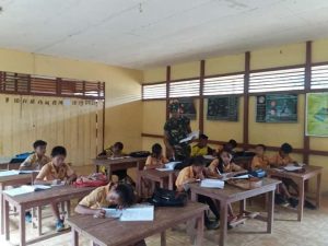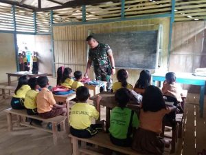 Sintang, Selasa (30/7/19)- Guna meningkatkan pengetahuan generasi muda bangsa, anggota Satgas TNI Manunggal Membangun Desa (TMMD) ke-105 Kodim 1205/Sintang, selain melaksanakan program pembangunan juga membantu mengajar di sekolah yang berada di daerah lokasi TMMD Desa Benua Kencana, Kec.Tempunak, Kab. Sintang.