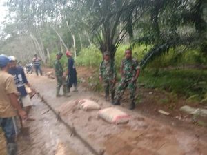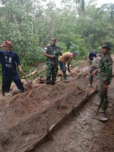 Babinsa dan masyarakat saling bahu membahu untuk mewujudkan desa mandiri Untuk pembuatan jalan rabat beton.
