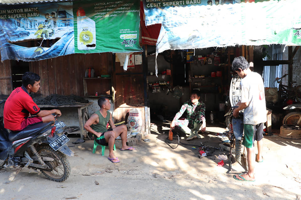 Sanggau – Kamis (9-04-2020) Serda Bunyamin tidak peduli dimana tempat disempatkan waktunya disela sela tugas Satgas TMMD melaksanakan komsos bertempat di bengkel milik pak Martinus dengan warga dusun Jonti dusun Sei Batu Kec Kapuas kab Sanggau.