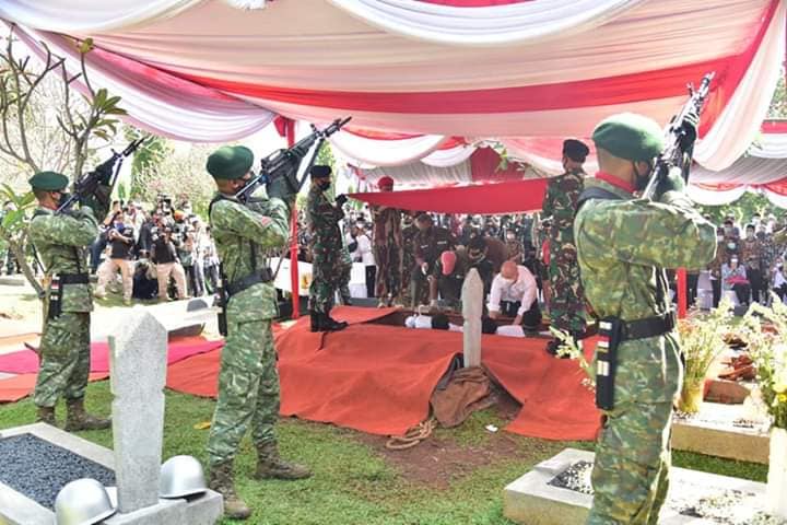 Kasad Jenderal TNI Andika Perkasa yang didampingi oleh istri Ny. Hetty Andika Perkasa terlihat sangat haru, memimpin upacara pemakaman salah seorang senior yang sangat dihormatinya dan menjadi tokoh teladannya sejak meniti karier di Kopassus, Kostrad dan Mabes Angkatan Darat.
