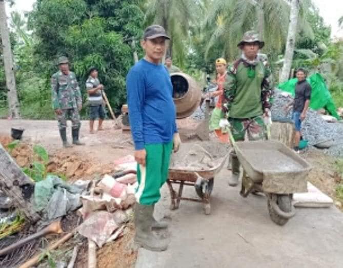 Setiap hari, tambah Hanise, belasan warga yang dipimpin Ketua Kelompok Tani Mekar Jaya, Saidi Norino dan lima anggota TNI beserta Babinsa Usriyansyah membaur mengaduk material dengan molen, mendorong arco dan menghamparkan semen.