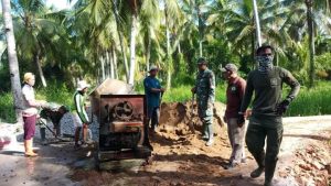 Koramil Sungai Pinyuh bersama Lembaga Pemberdayaan Masyarakat Desa (LPMD) Sungai Bakau Besar Laut dan warga Desa Sungai Bakau Besar Laut melaksanakan gotong royong membangun Jalan Usaha Tani
