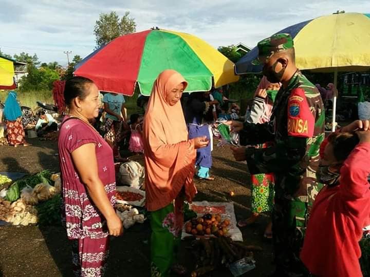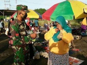 Suhaid, Selasa 16/06/20 – Demi memutus mata rantai penularan covid19 dan memastikan warga Desa Suhaid Kecamatan Suhaid, Personil Koramil 1206-15/Suhaid yang dipimpin oleh Danramil Kapten Inf Abbas turun kepasar untuk membagikan 50 masker kepada warga pengunjung pasar.