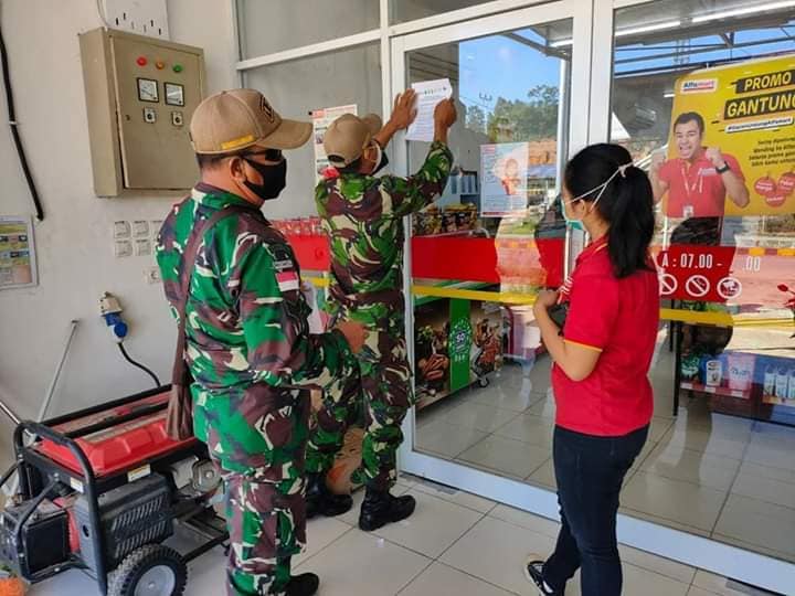 Sanggau, Dengan kebijakan pemerintah menerapkan Pola Hidup Baru “New Normal” dalam rangka memutus rantai penyebaran virus corona ( Covid-19) agar warga masyarakat mengikuti anjuran pemerintah untuk tetap menggunakan pola hidup bersih dan sehat dengan protokol kesehatan, Koramil 21/Entikong melakukan sosialisasi New Normal di sejumlah fasilitas umum (fasum)yang berada di Kecamatan Entikong