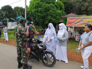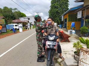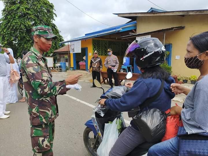 Semitau, Sabtu 20/06/20 – Koramil 1206-02/Semitau bersama Polsek, PolPP, Puskesmas dan yayasan budha suci sinar mas group membagikan 650 masker gratis bagi warga yang melintas di jalan poros Raden Surip (Semitau-Seberuang) Desa Semitau Hilir.