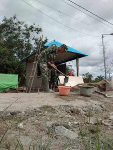 Galing – Koramil 1208-07/Sekura dibantu masyarakat setempat melaksanakan pengerjaan pengerasan jalan dengan Rabat beton di Desa Galing, Kec. Galing, Kab. Sambas, Senin/22 Juni 2020.