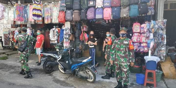 Babinsa mengharuskan setiap orang memakai masker, mencuci tangan dengan sabun atau hand sanitizer yang telah di sediakan oleh pihak pasar, toko, warung-warung serta di himbau kepada masyarakat agar tetap menjaga jarak dengan orang lain, Himbau Babinsa.