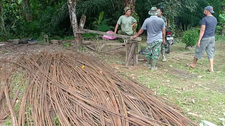 Bengkayang – Prajurit Satgas TMMD ke-108 Kodim 1202/Skw memulai merangkai kawat besi guna kerangka jembatan di Desa Danti, Kecamatan Sanggau Ledo, Kabupaten Bengkayang Provinsi Kalimantan Barat, Rabu (01/07/2020).