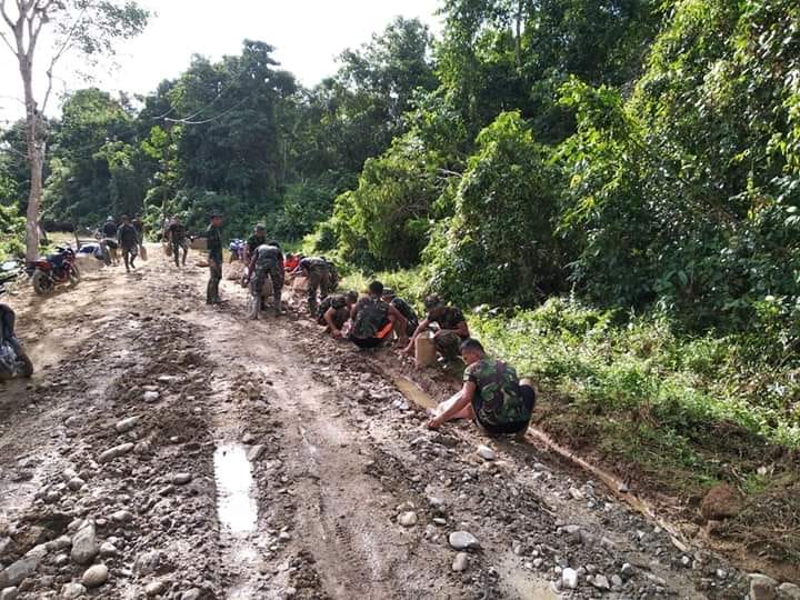 Sebagian lain Kelompok Masyarakat dan anggota Satgas TMMD ada yang pasir urug untuk meratakan badan jalan guna penyiapan rabat. Sementara itu, tim teknis TMMD bersama beberapa warga masyarakat ada yang tetap melaksanakan penataan ukuran bangunan jembatan.