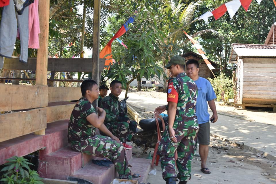 Kopda Ardianto, melepas lelah-nya setelah seharian bekerja di sasaran fisik rabat beton ini duduk di bawah pohon sambil di depan rumah warga yang di tempatinya, seraya menikmati suasana senja di tempat tugas.