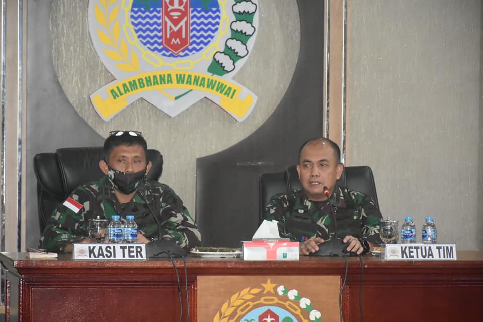 Sintang, Kepala Seksi Teritorial (Kasiterrem) 121/Abw Letkol Inf Daniel Edgar Syaloom Lalawi menyambut Tim Wasev Bujuk dan Doktrin dari Spaban VIII/Binjemen SRENAAD di ruang Kolakopsrem 121/Abw Jalan Pangeran Kuning Nomer 1 Sintang, Kamis (14/9).