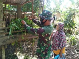Bengkayang – Prada Eri Jatmiko , di sela waktu senggang, selesai bekerja di lokasi TMMD, membantu ibu Sutini selaku warga setempat yang sedang memberi pakan kambing.