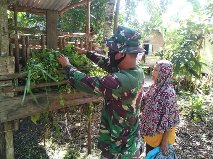 Disela istirahat selesai bekerja, Prada Eri Jatmiko melaksanakan Komsos dengan memberi pakan ternak kambing di halaman belakang rumah salah satu warga.