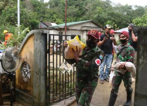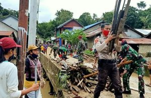 Satgas Yonif R 641/Bru bersama-sama dengan instansi lain, seperti Koramil, Polsek, Puskesmas, Pemdes dan organisasi kemasyarakatan bergotong-royong membantu warga dalam pemulihan pasca bencana.
