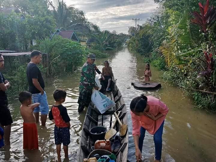 Sintang – Anggota Koramil 12/Tebidah bahu membahu membantu mengevakuasi korban banjir akibat air sungai pasang di 3 desa, yakni desa Ng Tebidah, desa Enrogong dan desa Landau Bara pada Jumat pagi (10/07/2020).