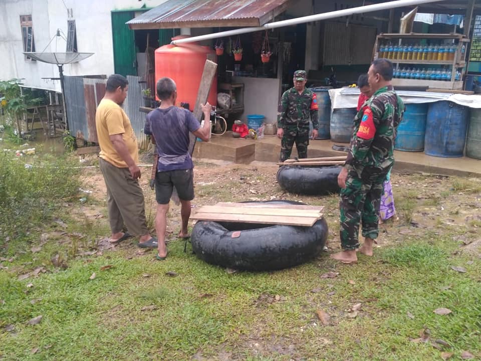 Melawi – Babinsa Koramil 18/Menukung menyiapkan ban bekas untuk mengevakuasi korban banjir di desa Menukung Kota, kecamatan Menukung Kabupaten Sintang pada sabtu pagi (11/07/2020).