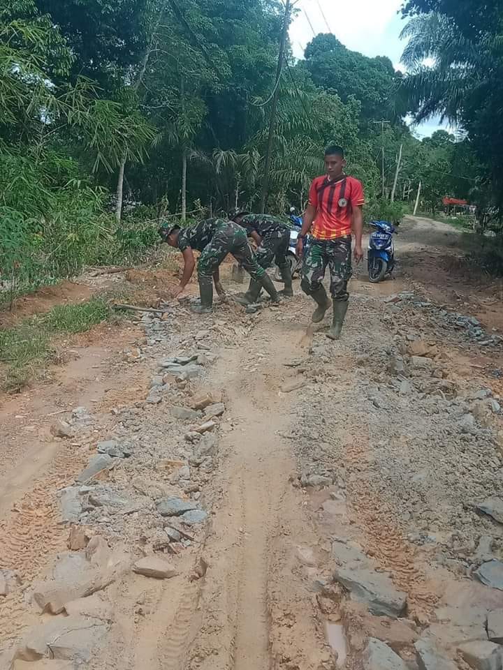 Sebagian Masyarakat bersama anggota Satgas TMMD meratakan tanah yang tinggi untuk ditimbunkan ke pinggir-pinggir jalan yang berlubang, karna hujan lubang yang tadinya kecil menjadi besar dan bisa membahayakan bagi pengendara.