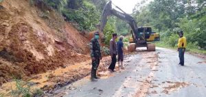 Melawi – Anggota Koramil 14/Sayan membantu proses evakuasi tanah longsor akibat curah hujan yang tinggi di jalan poros propinsi Pinoh – Kota Baru dengan menggunakan alat berat.