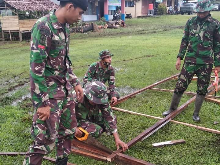 Bengkayang – Jajaran TNI yang tergabung dalam Satgas TMMD reguler ke 108 Kodim 1202/Skw tidak hanya hebat dalam memegang senjata dan bertempur, namun mahir memegang peralatan pertukangan terlihat saat pembuatan warung untuk warga berjualan.