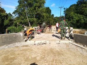 Pengerjaan yang di kerjakan secara gotong-royong sendiri, berlangsung dalam keceriaan. Tampak dari tawa dan canda anggota Satgas TMMD dan masyarakat dalam bekerja. Mengingat jembatan dalam proses akhir pembuatan, tentu masyarakat sangat senang.