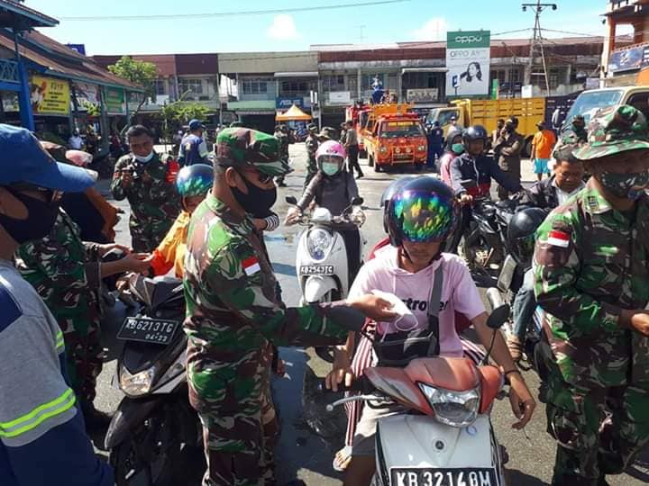 Sambas, Komando Distrik Militer ( Kodim) 1208/Sambas melaksanakan penyemprotan disinspektan secara serentak di wilayah Kabupaten Sambas, Senin ( 13/7/2020 ).