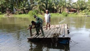 Prada Selomo Triasworo dan Prada Gilang,masih dengan seragam lengkapnya, dia menyeberangkan pak Ismail menyebrangi sungai menggunakan rakit bambu yang di kasih papan. Sosok Prada Selomo Triasworo dan Prada Gilang.