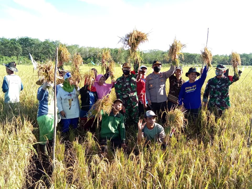 Sejangkung, Koramil 1208 -02/Sjk melakukan pendampingan panen padi perdana di dusun Rambayan desa Parit Raja Kec.Sejangkung Kabupaten Sambas, Kamis ( 15/7/2020 ).