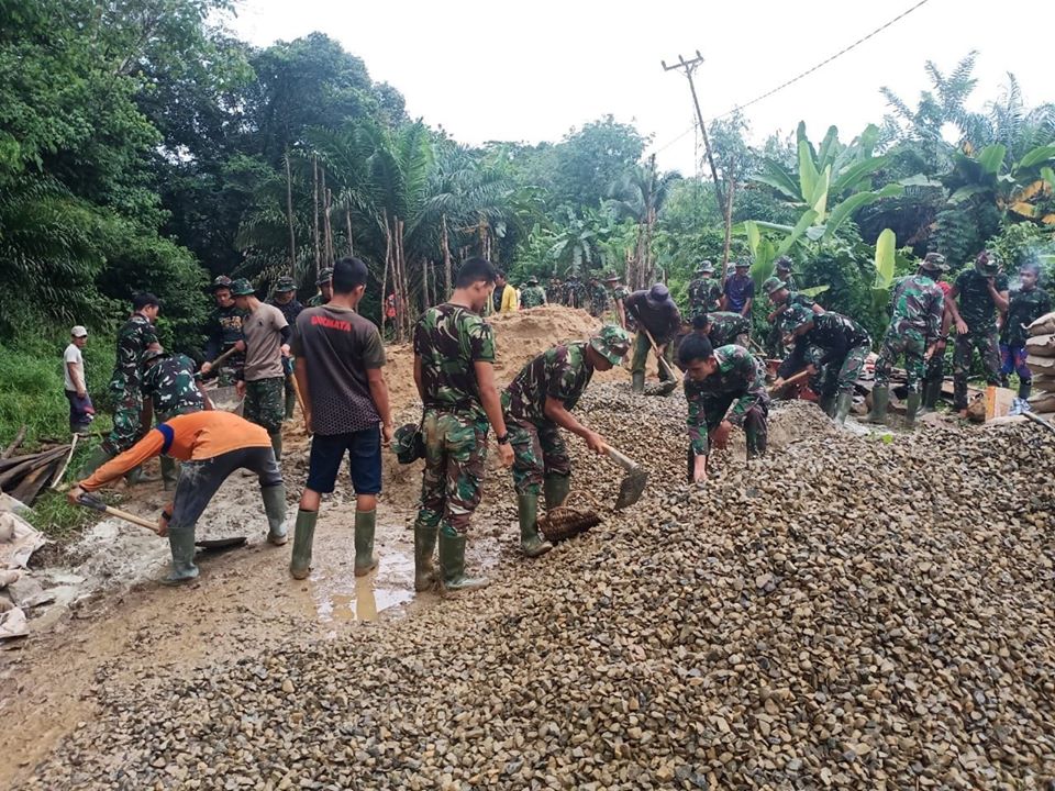 Anggota satgas TMMD Kodim 1202/ Singkawang seperti Sertu Jarwani salah satu anggota Satgas TMMD 108 di Desa Danti dengan lihai dan handal mengaduk semen dan mengecor.