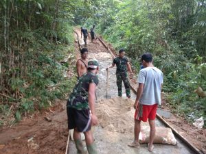 Ketapang – Minggu (19/7/20) Kegiatan pembangunan di sasaran Fisik oleh satgas TNI Manunggal Membangun Desa (TMMD) Reguler Ke -108 Kodim 1203/Ketapang di Desa Beringin Rayo, Kec. Tumbang Titi, terus kerjakan meskipun hari libur.