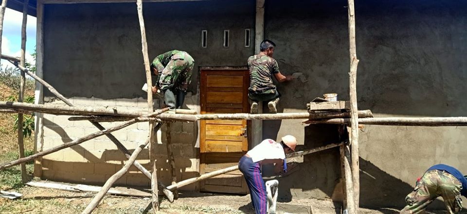 Seperti di kegiatan pembangunan kantor desa yang blm di pelaster bangunan luarnya, sejumlah anggota Satgas juga terlibat di kegiatan yang berlangsung di Kantor Desa Danti, Kecamatan Sanggau Ledo.