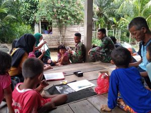 Prada ibrahim anggota satgas TMMD Regtas 108 asal satuan Yonif 645/GTY yang setelah selesai melaksanakan tugas pengerjaan di sasaran TMMD menghampiri rumah Sholihin yang kebetulan sedang duduk santai bersama istri dan anaknya, bapak