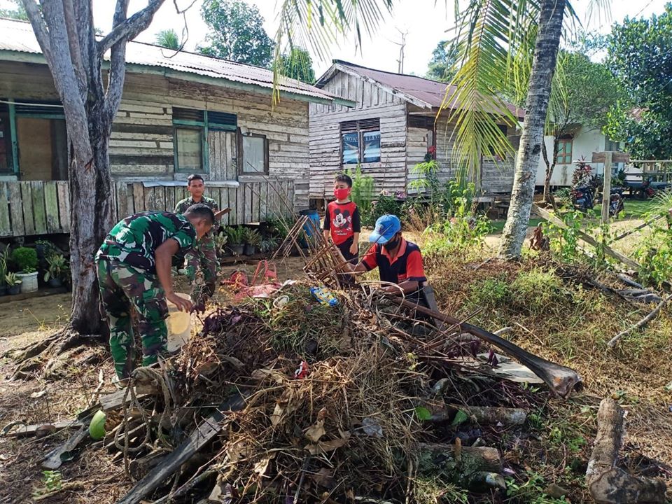 Bengkayang – Anggota TNI dari Satgas TMMD 108 Kodim 1202/Skw Bantu Warga Bersihkan Sampah yang ada di sekitar rumah, Kegiatan ini dilakukan untuk menjaga kebersihan dan menanamkan hidup bersih di Desa Danti Kecamatan Sanggau Ledo Kabupaten Bengkayang, Rabu (22/07/2020).