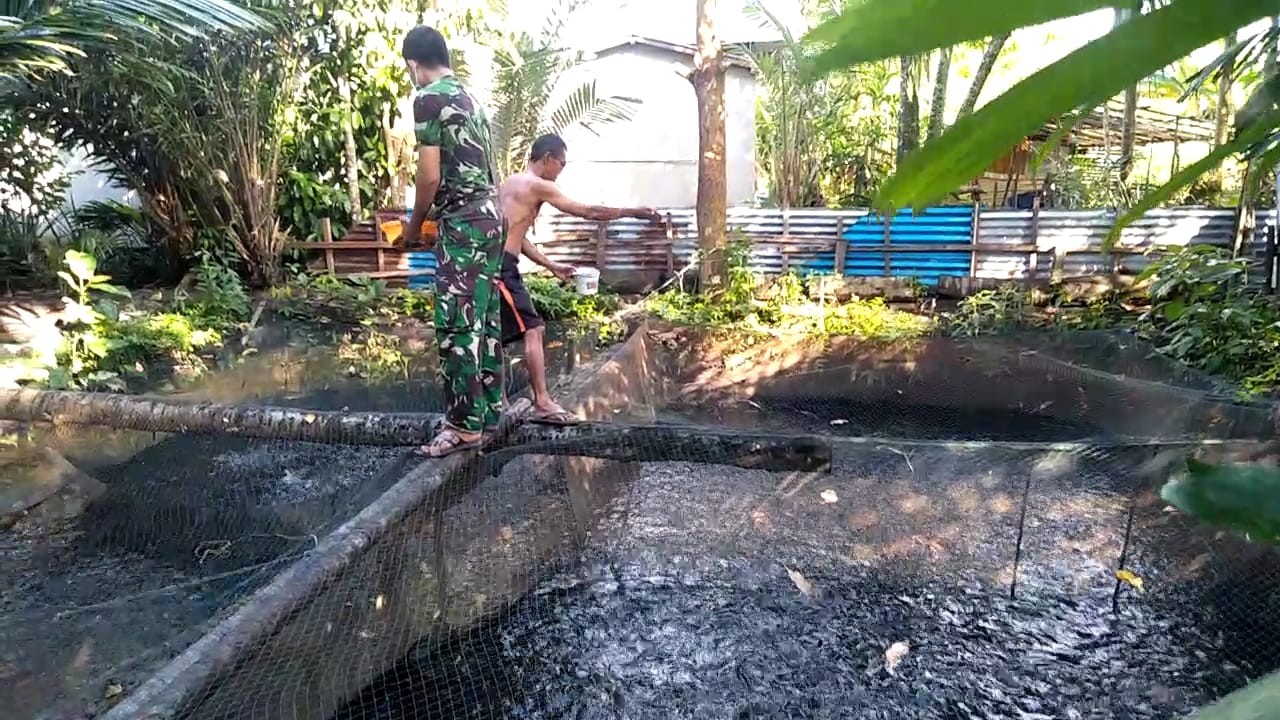 Personel Satgas TMMD Serda Handayu menimba ilmu kepada bapak Martinus warga desa, yang selama ini menekuni budidaya ikan nila, kesempatan ini lantas tidak di sia siakannya.