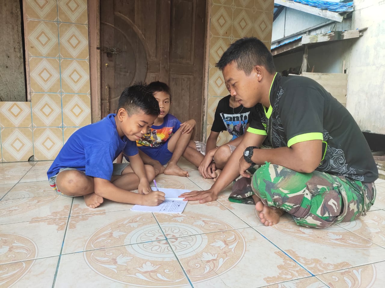 Salah satunya seperti yang dilakukan oleh Prada Arjuna personel satgas TMMD, menemani anak anak di salah satu teras rumah milik warga untuk belajar Pada senggang dari aktivitas pekerjaan.