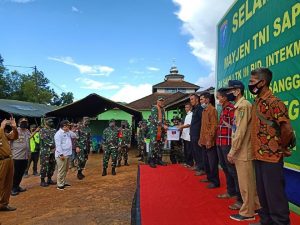 Bengkayang – Mayjen TNI Sapriadi disela-sela, kunjungan dalam rangka peninjauan kerja TMMD memberikan bantuan bingkisan kepada warga terdampak covid-19 di desa Danti.