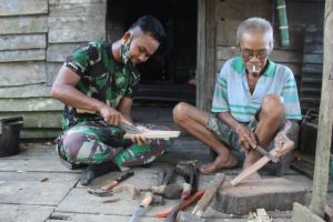 Seperti yang dilakukan Prada wahab Personel Satgas TMMD setelah melaksanakan pengerjaan disasaran fisik di sore hari menyempatkan singgah di rumah bapak Akhe (59) warga desa yang sedang asik meraut kayu untuk dijadikan ulu atau gagang serta membuat sarung parang diteras depan rumahnya