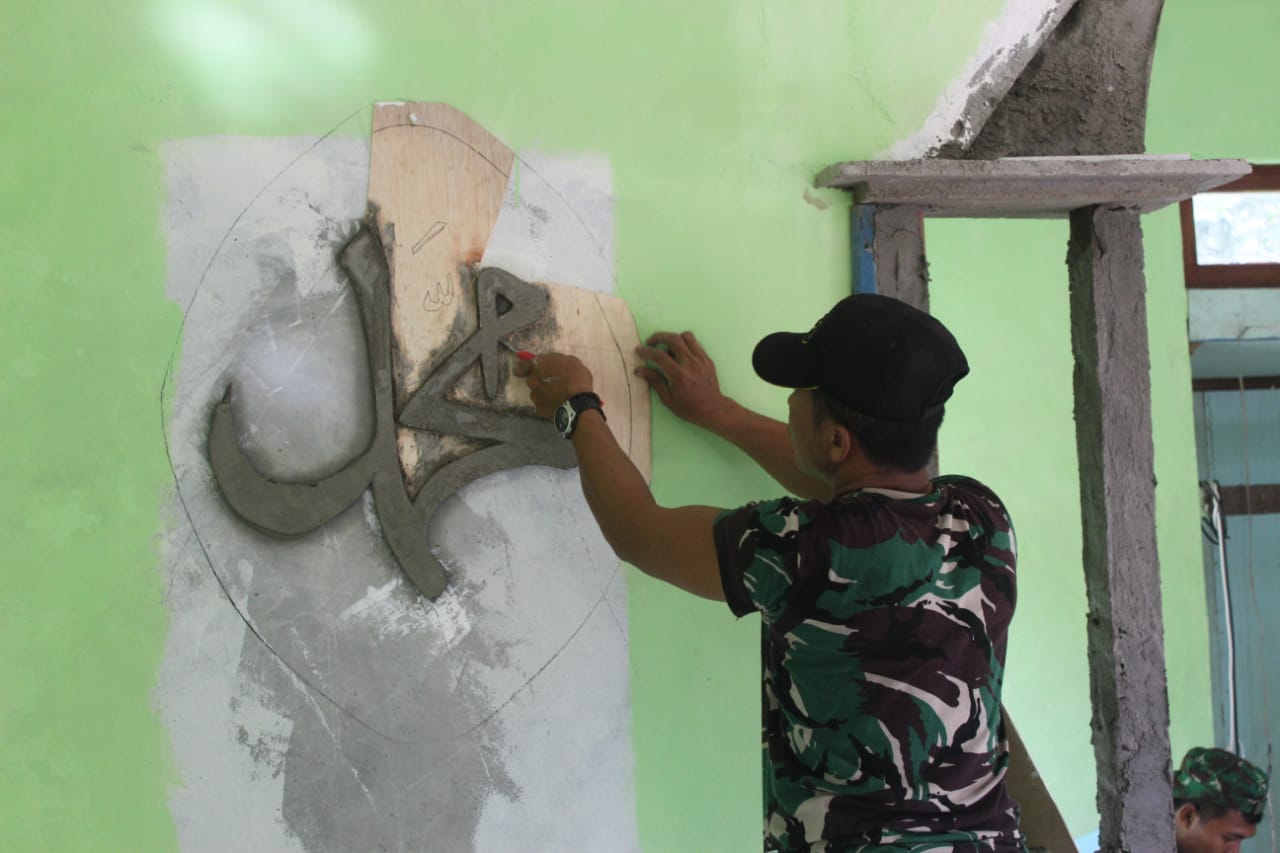 Rangkaian kegiatan TMMD Reguler Ke-108 di desa beringin rayo terus ditingkatkan pengerjaanya bersama warga sekitar, salah satunya merehap Mushola At-Taqwa dengan membuat karya seni kaligrafi