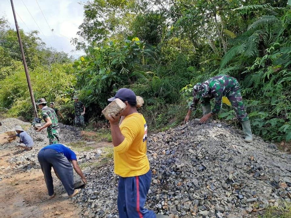 Bengkayang – TMMD Reguler perbatasan ke -108, Kodim 1202/ Singkawang para personel TNI yang tergabung dalam Satgas TMMD bersama warga masyarakat melaksanakan kegiatan bergotong royong penimbunan jalan yang becek dengan sirtu, Sabtu ( 25/07/2020 ).