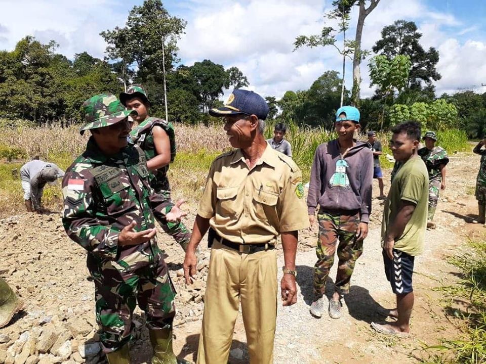 Keakraban warga dan Satgas TMMD Kodim 1202/Skw kian terasa. Seperti saat Sertu Teguh berinteraksi melakukan komunikasi sosial dengan perangkat Desa Danti.