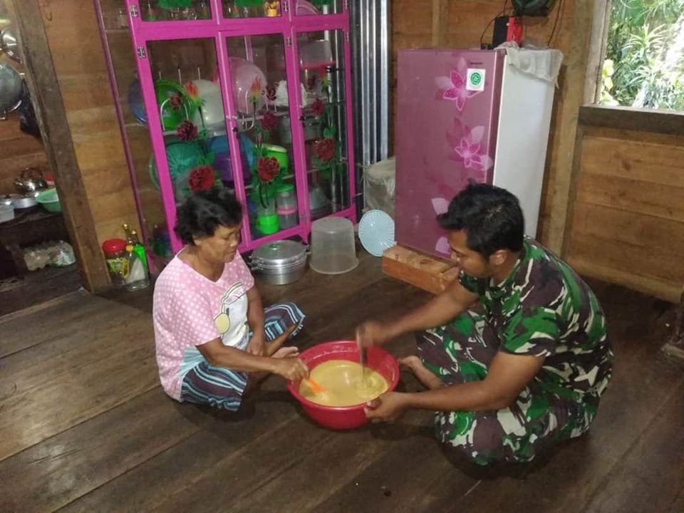 Disaat mengerjakan sasaran program TMMD Reguler ke-108 TA 2020, Kodim 1202/ Skw, selain tinggal di rumah-rumah warga, anggota Satgas juga turut membantu sang pemilik rumah, salah satunya adalah memasak, membuat kue dengan tujuan untuk mempererat kebersamaan.