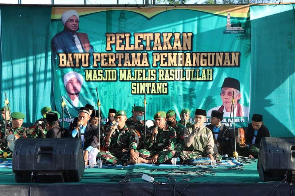 Sintang – Grup Marawis Kodim 1205/Sintang turut memeriahkan acara peletakan batu pertama pembangunan Masjid Majelis Rasulullah Sintang di kelurahan Rawa Mambok, Sintang pada Rabu sore (29/07/2020).