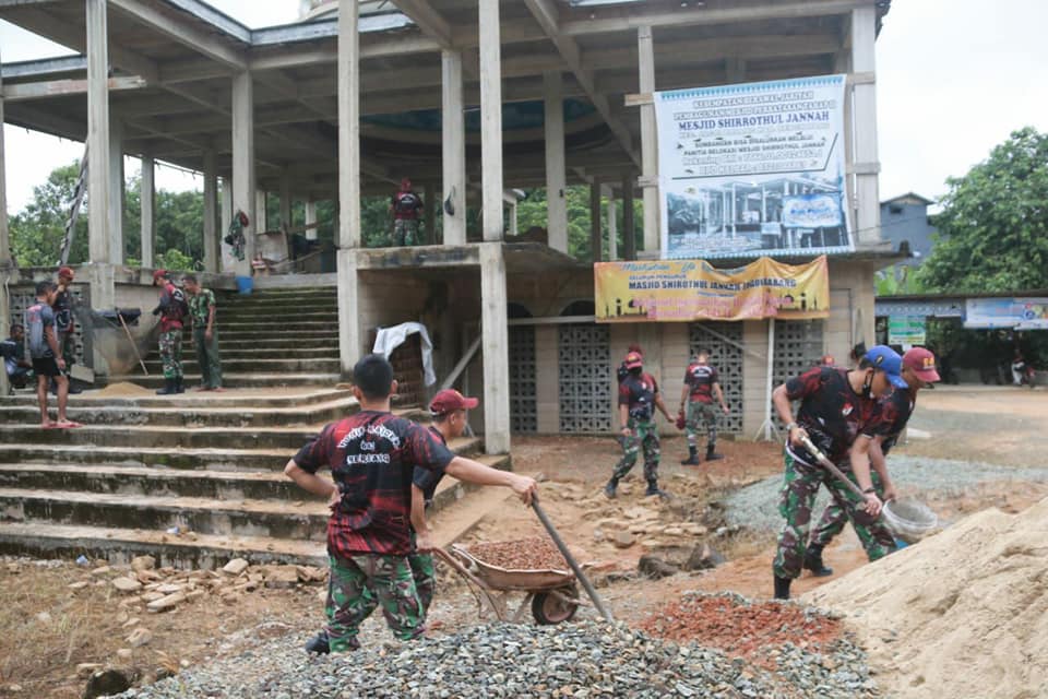 Prajurit TNI Yonif R 641/Bru yang tergabung dalam Satgas Pamtas RI-Malaysia melaksanakan karya bhakti berupa perbaikan Masjid Sirotul Jannah di Dusun Risau, Desa Jagoi, Kecamatan Jagoi Babang, Kabupaten Bengkayang pada Kamis (30/07).