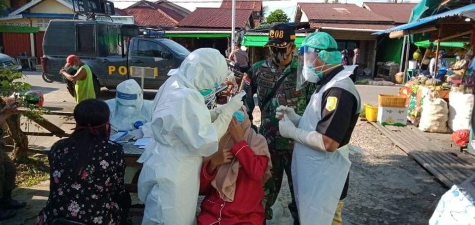 Ya,” Pagi ini kami melakukan Patroli, Membagikan Masker gratis sebanyak 300 buah serta Melaksanakan tes SWAB secara acak kepada 20 masyarakat,”Ucap Fatah