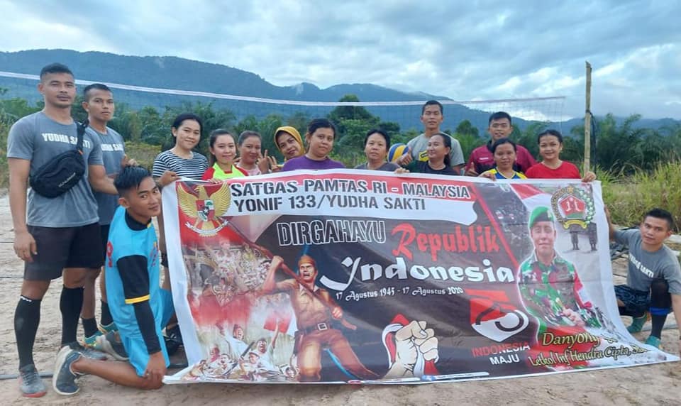 Puring Kencana – Personel Pos Kantuk Asam Satgas Pamtas RI-Malaysia Yonif 133/YS menggelar aneka perlombaan menyambut HUT ke-75 Kemerdekaan RI di wilayah tapal batas.
