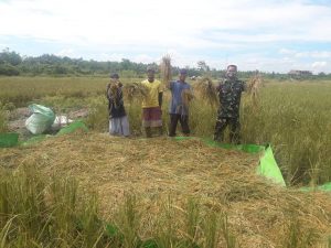Tekarang – Guna meningkatkan produksi pangan di Kabupaten Sambas, Babinsa Koramil 03/Tebas Serda Rinto melaksanakan pendampingan kepada Petani yang tergabung melalui Gabungan Kelompok Tani ( Gapoktan ) Bakung Berokah, untuk melakukan panen padi dilahan persawahan Desa Sempadian Kec. Tekarang, Rabu ( 18/08/20 ).