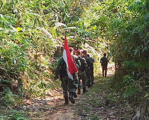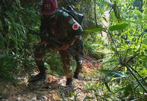Entikong, Sanggau (24/8) Satgas Pamtas RI-Malaysia Yonif R-641/Beruang terus melakukan patroli jalur-jalur tidak resmi atau sering disebut “jalan tikus” di sepanjang garis perbatasan kedua negara untuk mencegah adanya aktivitas ilegal yang memanfaatkan situasi pandemi Covid-19.