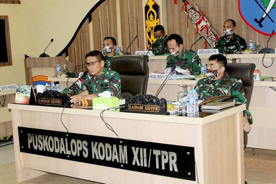 Kubu Raya, Rabu (26/8/20) – Panglima Kodam XII/Tanjungpura, Mayjen TNI Muhammad Nur Rahmad memimpin Rapat Evaluasi Pelaksanan Operasi Pengamanan Perbatasan Koopsdam XII/Tpr. Rapat evaluasi dilaksanakan secara virtual di Ruang Rapat Puskodalopsdam XII/Tpr.