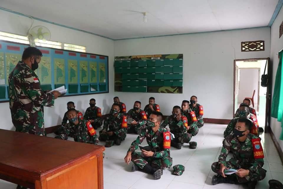 Sintang – sebanyak 36 Bintara baru mendapatkan latihan dan pembekalan personel baru masuk satuan oleh anggota Kodim 1205/Sintang di Aula Makoramil 07/Sintang Jalan Dr Wahidin Sudirohusodo, Sintang pada Jumat (28/08/2020).