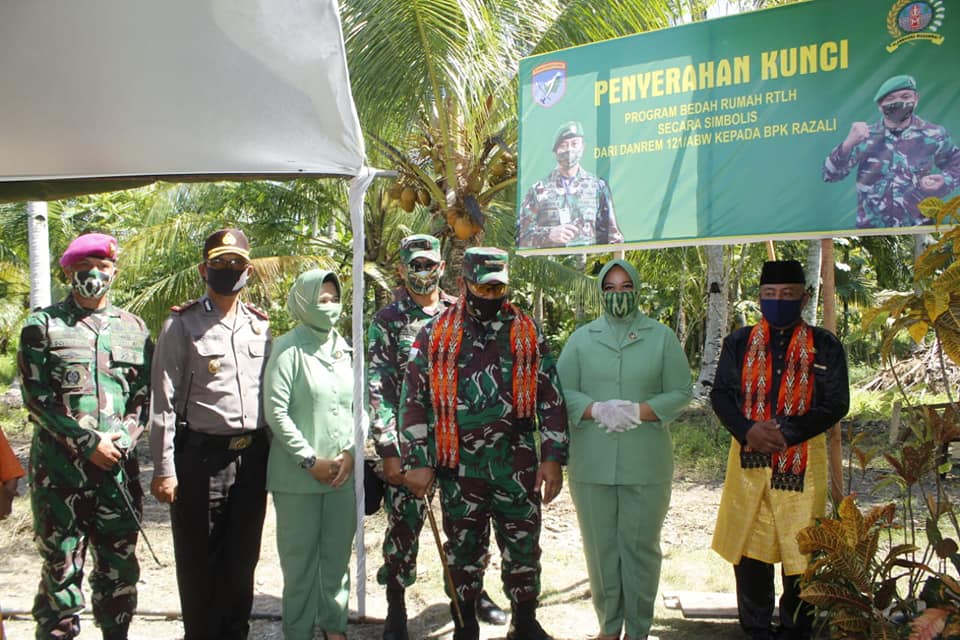Danrem 121/Abw Brigjen TNI Ronny, S.A.P saat mendatangi rumah bapak Razali didampingi ketua Persit KCK Koorcab Rem 121 Ibu Rissa Ronny serta Forkorpimda kab Mempawah.