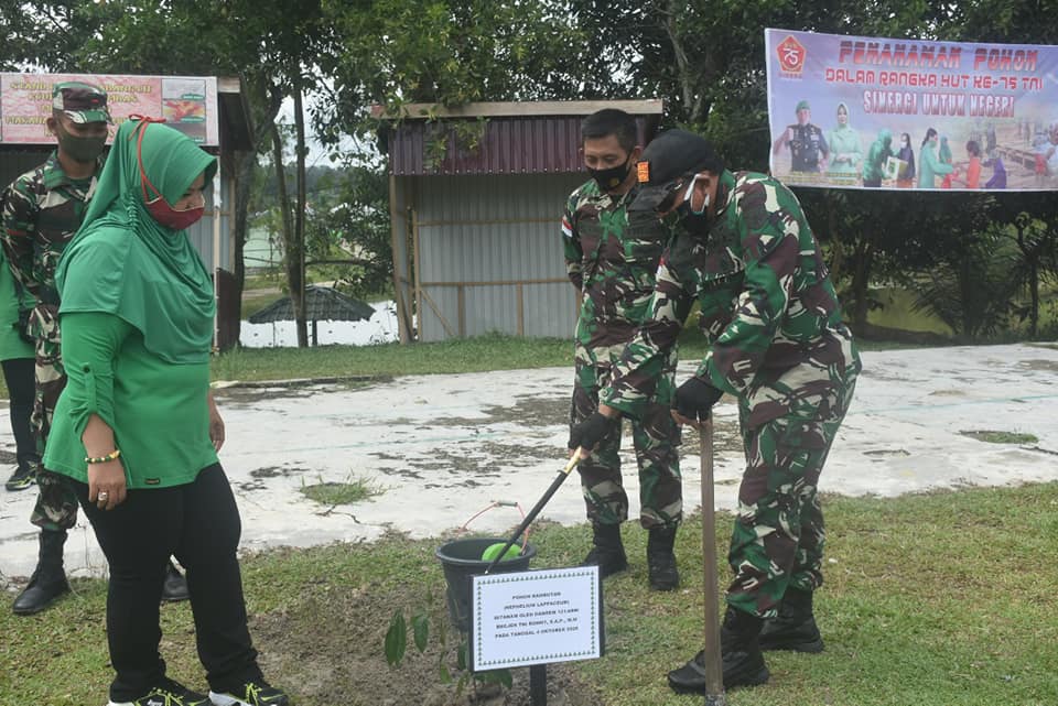 Dalam rangka memperingati HUT TNI ke 75 jajaran Korem 121/Abw melakukan penanaman pohon Pada Minggu/4 Oktober 2020.